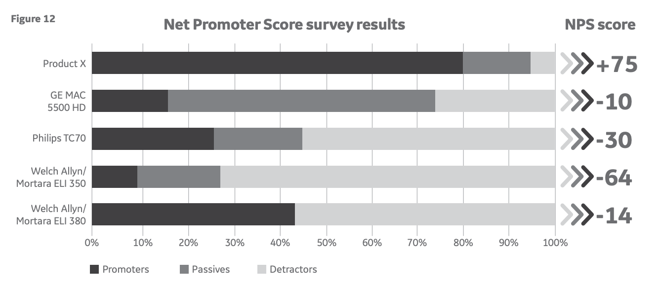 The MAC VU360 achieved a NPS of 75 where other competitor products’ NPS was below zero. Source - https://www.gehealthcare.com/-/jssmedia/gehc/us/images/products/diagnostic-ecg/mac-vu360/redesign/mac-vu360-case-study.pdf?rev=-1